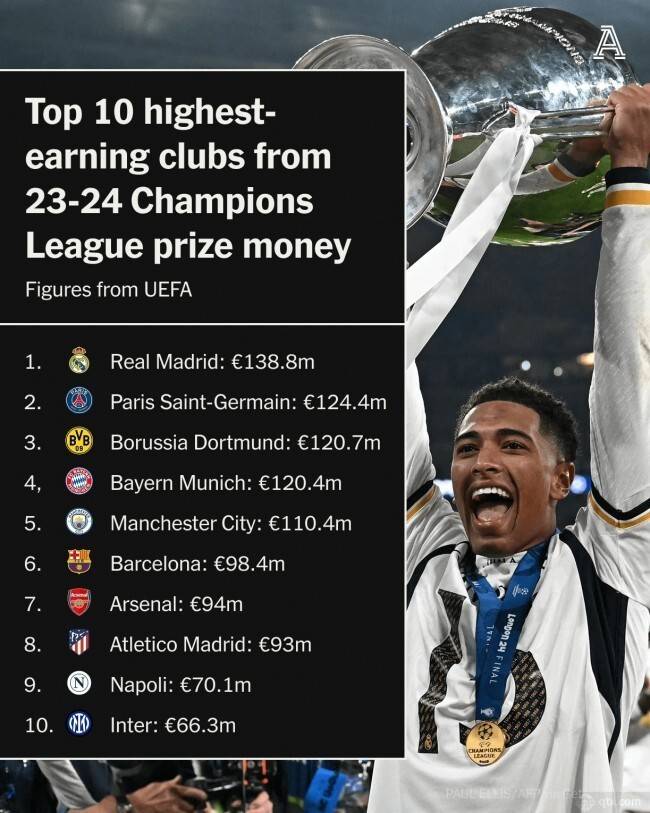 根据官方公布的数据,上赛季欧冠冠军皇马一共获得最高的1.388亿欧元奖金,巴黎圣日耳曼紧随其后获得1.244亿欧元,多特蒙德作为上赛季欧冠亚军则获得了1.207亿欧元,拜仁慕尼黑则获得了1.204亿欧元,曼城获得了1.104亿欧元,这五队的奖金都超过1亿欧元。