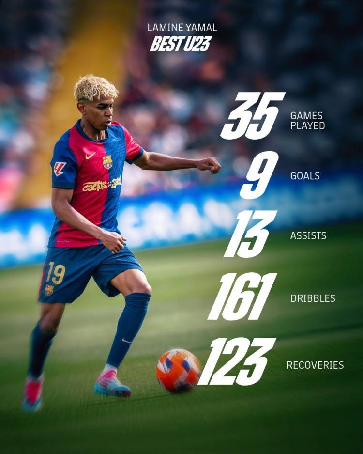 巴萨社媒晒出亚马尔本赛季西甲个人数据海报,并配文:当下与未来的璀璨巨星💎