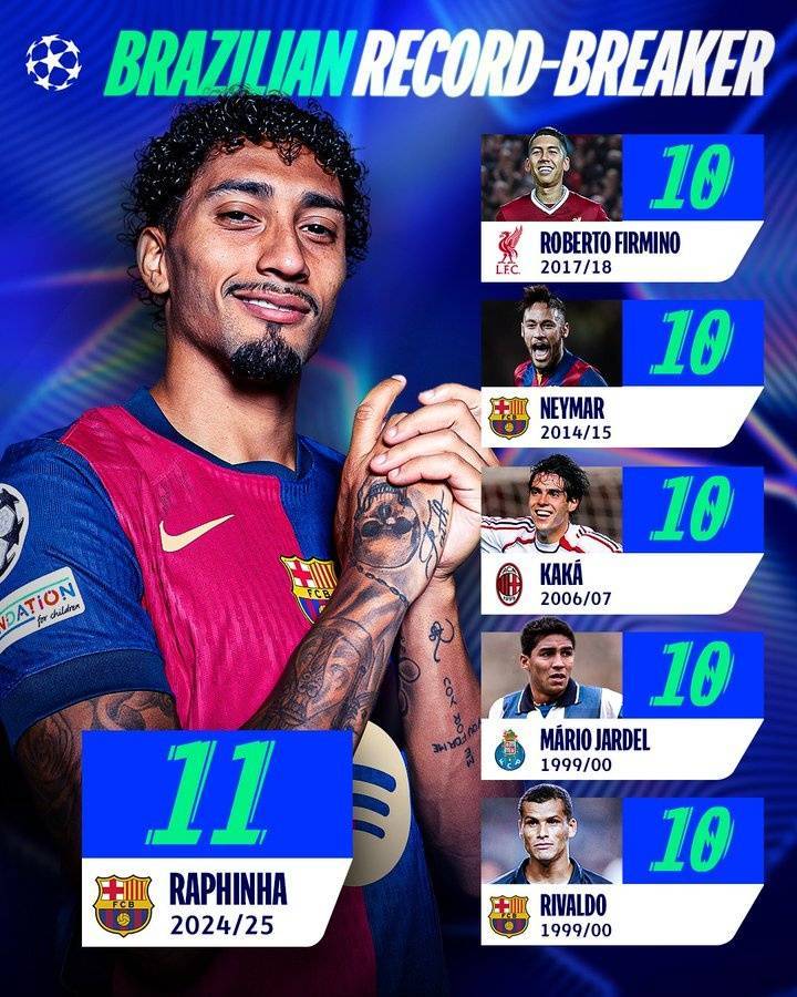 本赛季,拉菲尼亚欧冠已经打入了11球,成为单赛季欧冠进球最多的巴西球员,超过菲尔米诺(17-18赛季10球)、内马尔(14-15赛季10球)、卡卡(06-07赛季10球)、贾德尔(90-00赛季10球)和里瓦尔多(99-00赛季10球)。